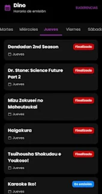Dino Anime H es una aplicación gratuita para Android que permite a los aficionados al anime consultar horarios de emisión y estrenos de sus series favoritas. Con una interfaz intuitiva, los usuarios pueden acceder a la programación diaria de animes, así como descubrir nuevos títulos que se transmiten cada día de la semana. La aplicación está diseñada para mantener a los fans organizados y al día con los episodios más recientes.